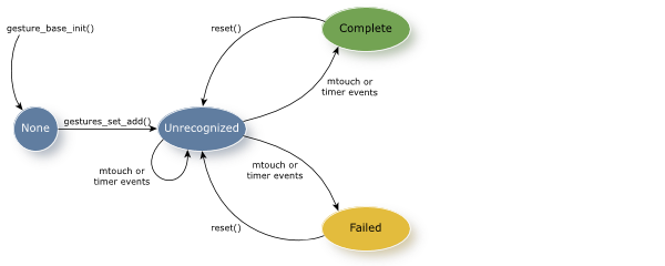 This callback function is invoked as a result of either an mtouch or a timer event. Although your gesture callback will be invoked on other state transitions, your application is usually interested only when the gesture has been recognized or not. That is, you would usually implement application behavior based on your gesture recognizer in the GESTURE_STATE_COMPLETE or the GESTURE_STATE_FAILED state.