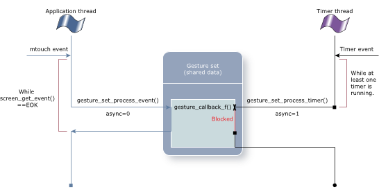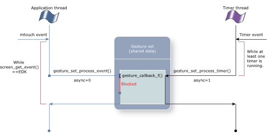 The following diagrams show that the gesture set is shared between two separate threads. Each of these threads (application and timer) can be blocked by the other thread when accessing the shared data.