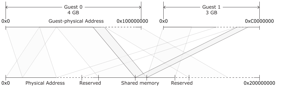 In a QNX virtualized environment, a guest configured with 1 GB of RAM will see 1 GB available to it, just as it would see the RAM available to it if it were running in a non-virtualized environment. This memory allocation appears to the guest as physical memory. It is in fact memory assembled by the virtualization configuration from discontiguous physical memory. ARM calls this assembled memory intermediate physical memory; Intel calls it guest physical memory. For simplicity we will use guest-physical memory, regardless of the platform (for more information, see guest-physical memory in the Terminology section).