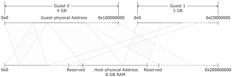 In a QNX virtualized environment, a guest configured with 1 GB of RAM will see 1 GB available to it, just as it would see the RAM available to it if it were running in a non-virtualized environment. This memory allocation appears to the guest as physical memory. It is in fact memory assembled by the virtualization configuration from discontiguous physical memory. ARM calls this assembled memory intermediate physical memory; Intel calls it guest physical memory. For simplicity we will use guest-physical memory, regardless of the platform (for more information, see guest-physical memory in the Terminology section).