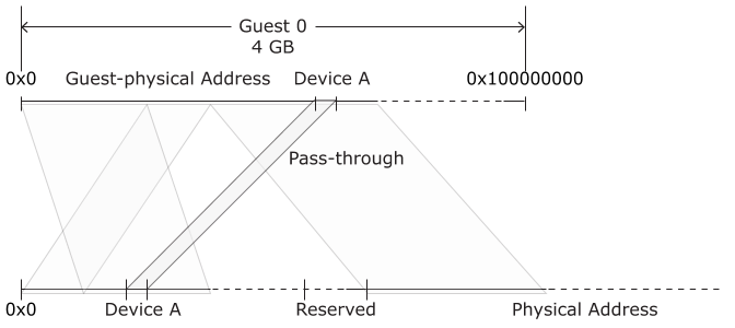 For example, Device A may be configured at 0x100 in Guest 0's physical memory. This device may be configured as a pass-through device for Guest 0 at this same location (0x100), so when Guest 0 needs to access the device, it looks at 0x100. However, we should remember that when a guest looks at a physical address, it is looking at a guest-physical address, which translates into some other address in host-physical memory, say 0xC00000100.