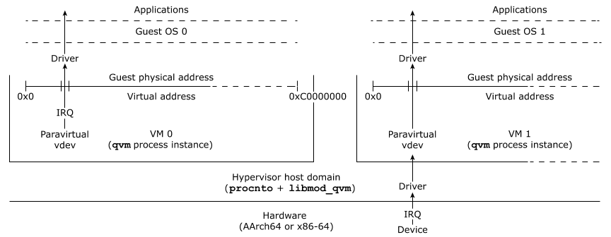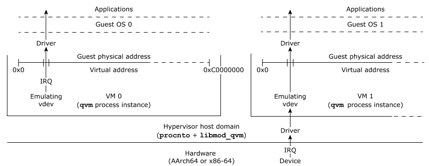In a hypervisor system, vdevs are provided by the hypervisor in the qvm process for the VM that hosts the guest. The guest hosted in the VM receives interrupts from the vdev and sends signals to it, exactly as though it were working with a physical hardware device. The guest has no direct communication with any physical device on the system; such a device might not even be present.