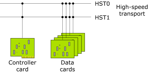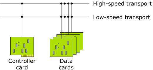 This configuration has asymmetric transport: a High-Speed Transport (HST) and a reliable and economical Low-Speed Transport (LST). You might use the HST for user data, and the LST exclusively for out-of-band control (which can be very helpful for diagnosis and during booting). For example, if you use generic Ethernet as the LST, you could use a DHCP ROM on the data cards to economically boot—no flash would be required on the data cards.